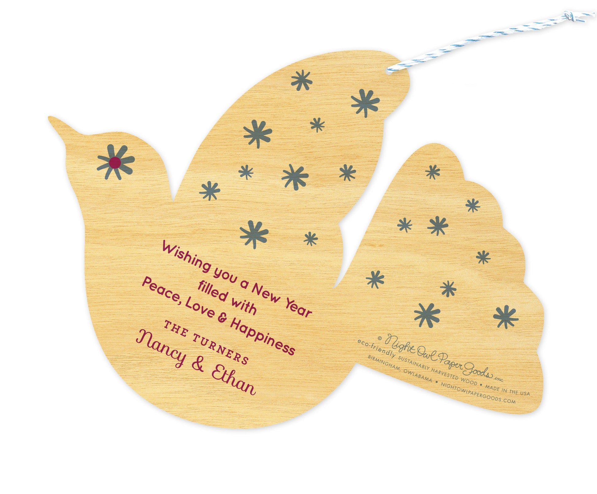 Celebrate the season with our Rainbow Dove holiday ornament cards featuring a colorful pastel rainbow dove with an uplifting “Peace” sentiment on the front and your custom text on the back. Printed on your choice of real wood or eco-friendly paper, these custom ornament cards are simple to customize and perfect for sending warm wishes to friends, family and colleagues. To get started: