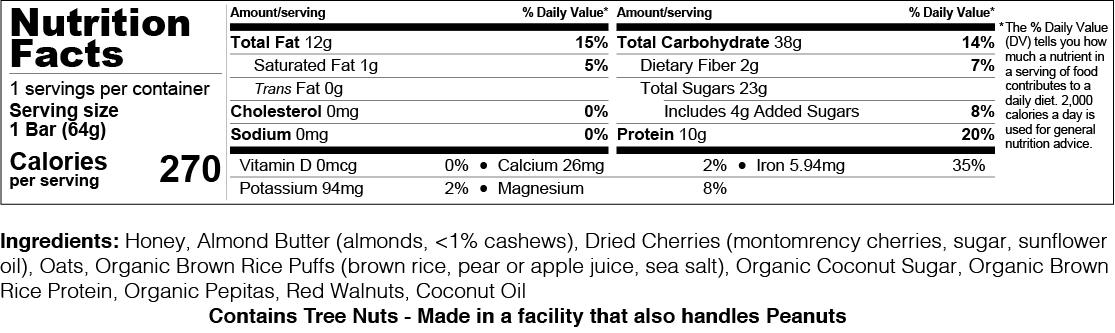 Made with almond butter, gluten free oats, red walnuts, pepitas, tart cherries, and coconut oil, it's the perfect partner for a workout or a cup of coffee!