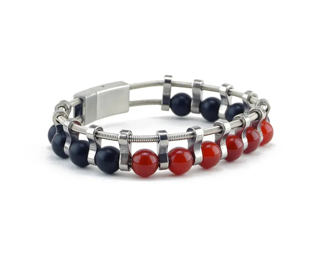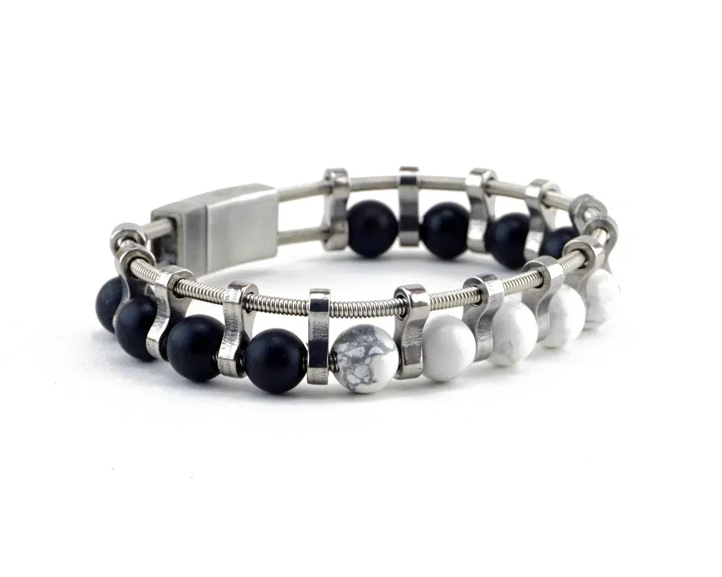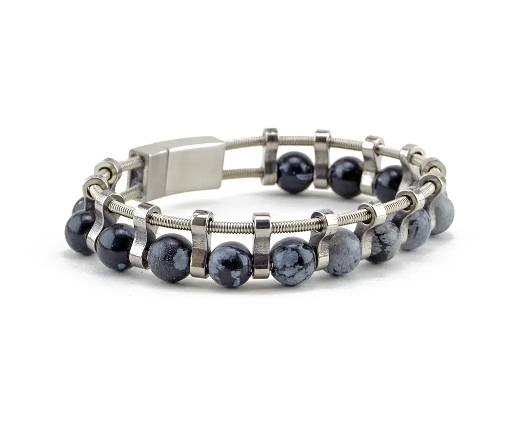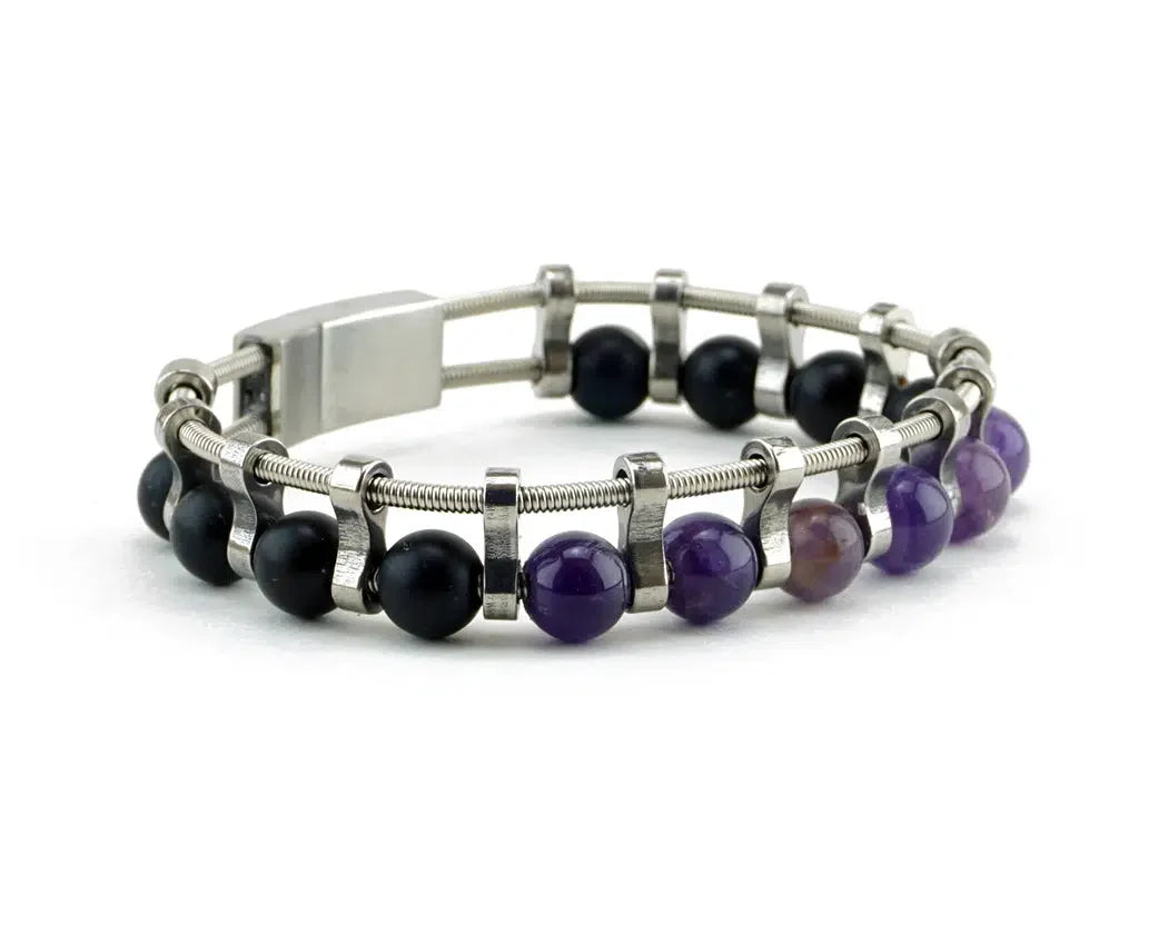 We updated our Ricky bracelet for 2025! Ricky now features an asymmetrical design with two bass A strings joined together by stainless steel connector beads. The lower string is then adorned by your choice of stone bead.