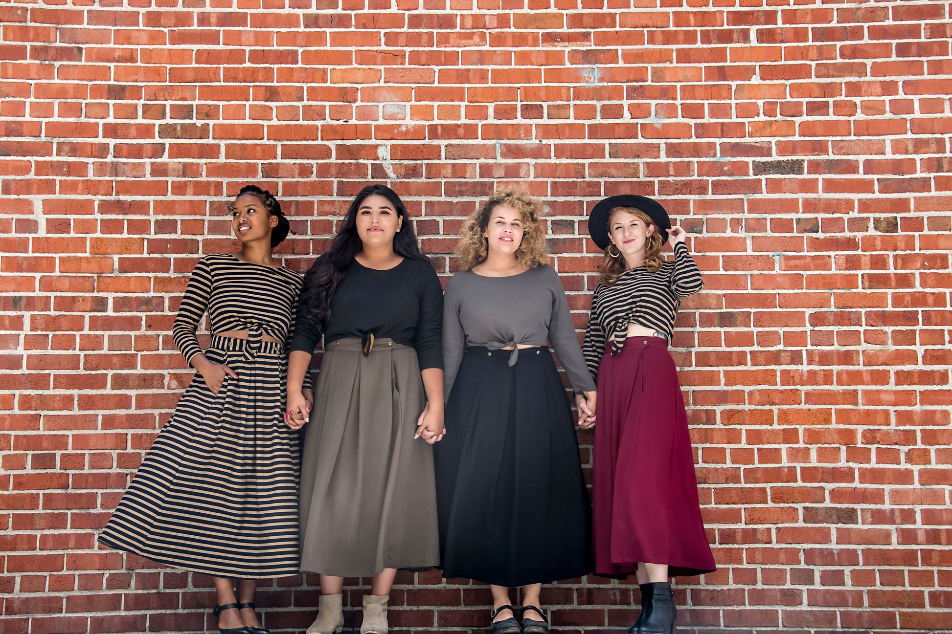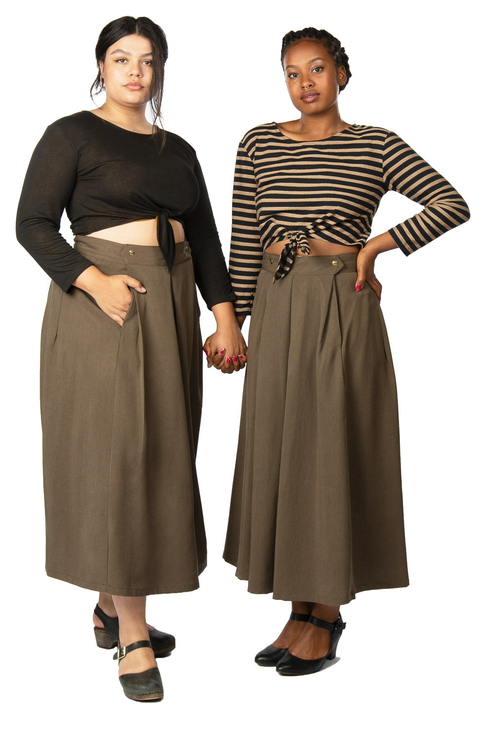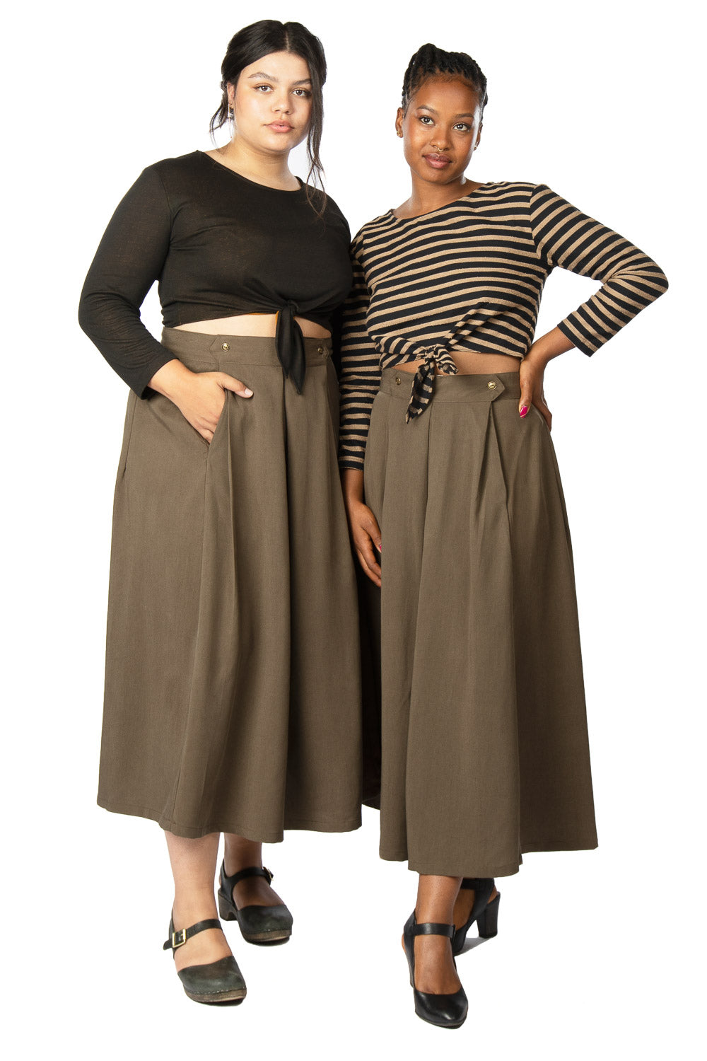 Rue skirt in Olive Green Tencel. Our most supportive skirt yet with fused interfaced waistband. Brass button closure, box pleats a center front add a-line flair and a hidden single kangaroo style pocket under pleats. Midi length, high waisted prairie style and great for twirling. Waist measurement runs a little smaller than our usual sizes, you may want to size up. See chart below for maximum waist width.