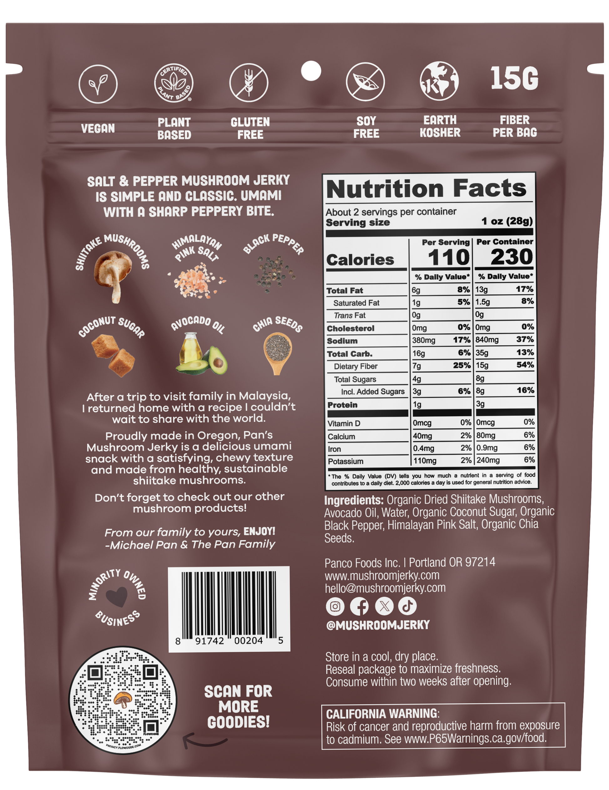 Ingredients: Organic Dried Shiitake Mushrooms, Avocado Oil, Water, Organic Coconut Sugar, Organic Black Pepper, Himalayan Pink Salt, Organic Chia Seeds.