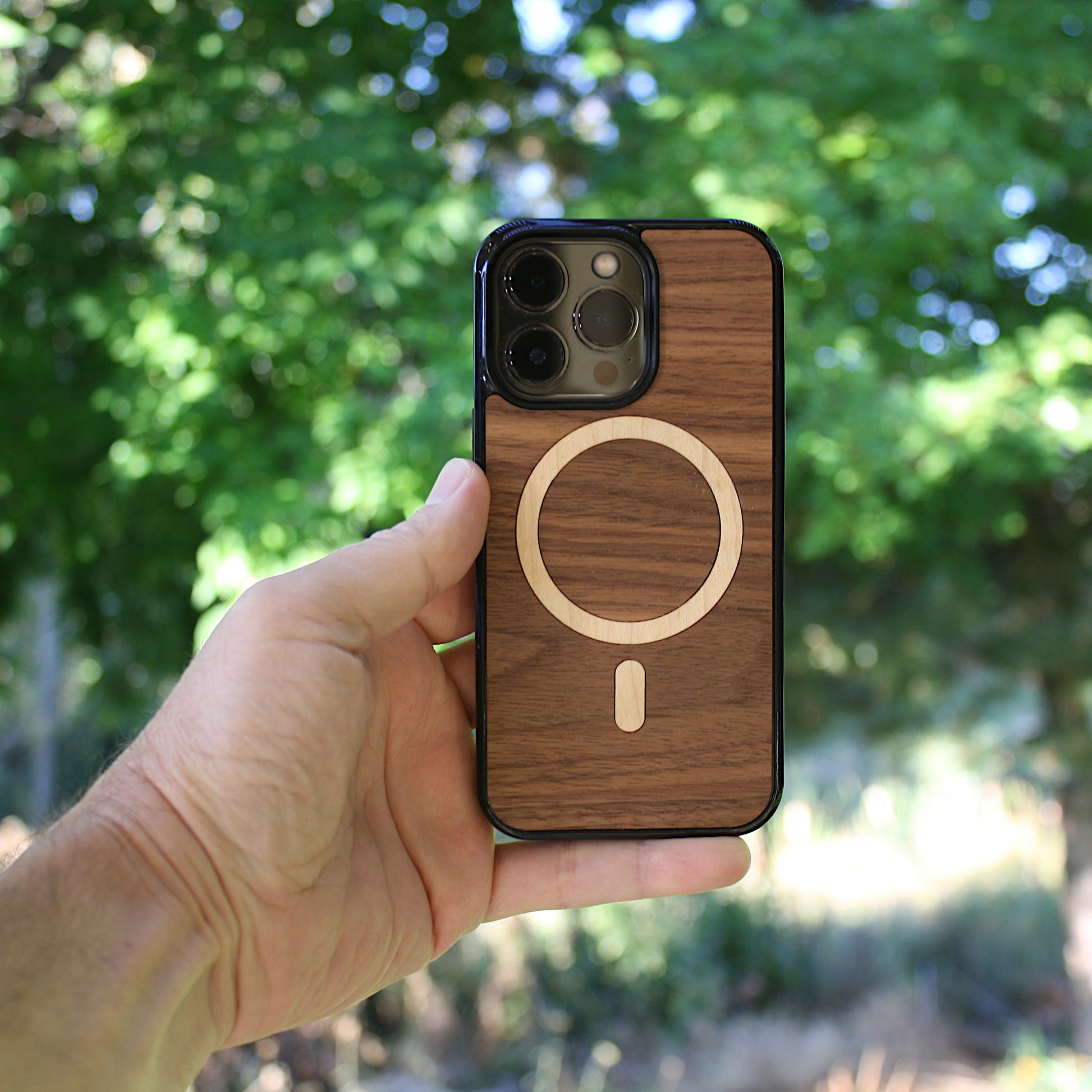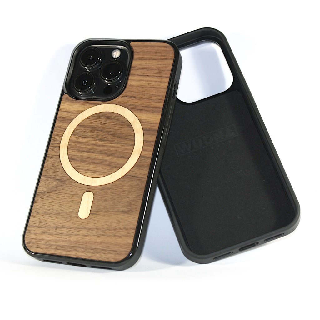 Unique multi-wood inlay MagSafe design in real Black Walnut and Maple.