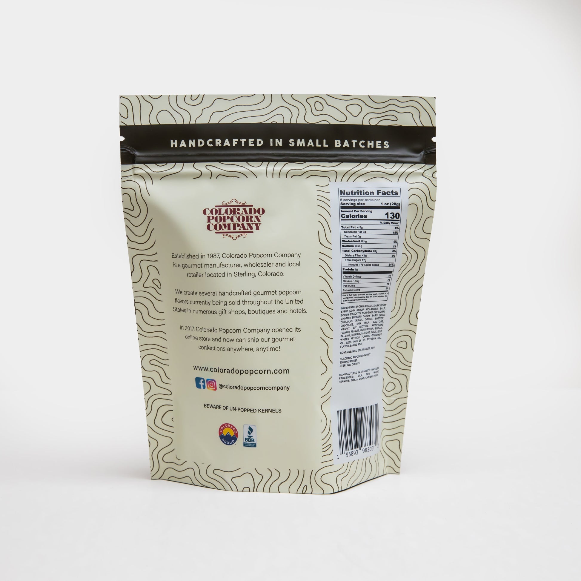 INGREDIENTS: NON-GMO POPCORN, BROWN SUGAR, DARK CORN SYRUP, COCONUT OIL, SNICKERS CANDY(MILK CHOCOLATE (SUGAR, COCOA BUTTER, CHOCOLATE, LACTOSE,SKIM MILK, MILKFAT, SOY LECITHIN, ARTIFICIALFLAVOR), PEANUTS, CORN SYRUP, SUGAR, SKIM MILK, BUTTER, MILKFAT, PARTIALLY HYDROGENATED SOYBEAN OIL, LACTOSE, SALT EGG WHITES, ARTIFICIAL FLAVOR), BAKING SODA, SOY LECITHIN, SOYBEAN OIL, SALT.