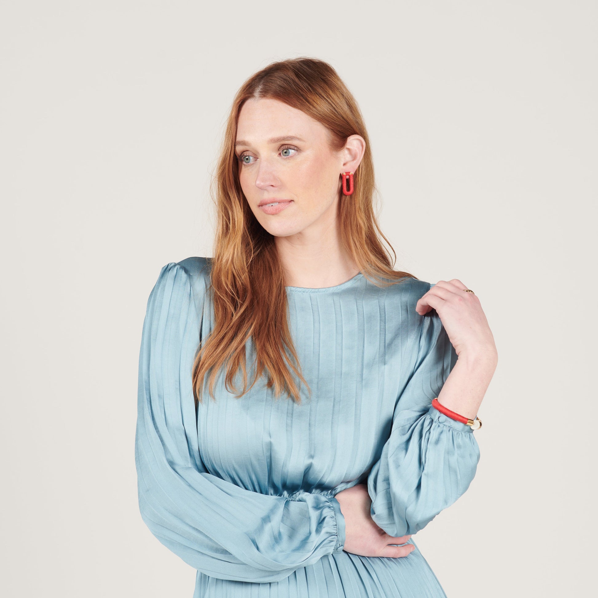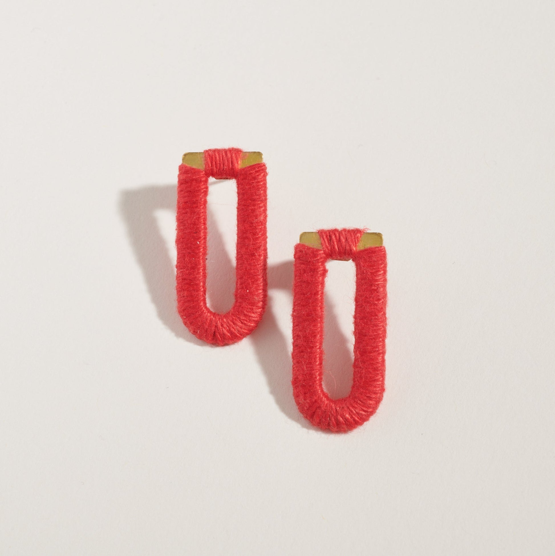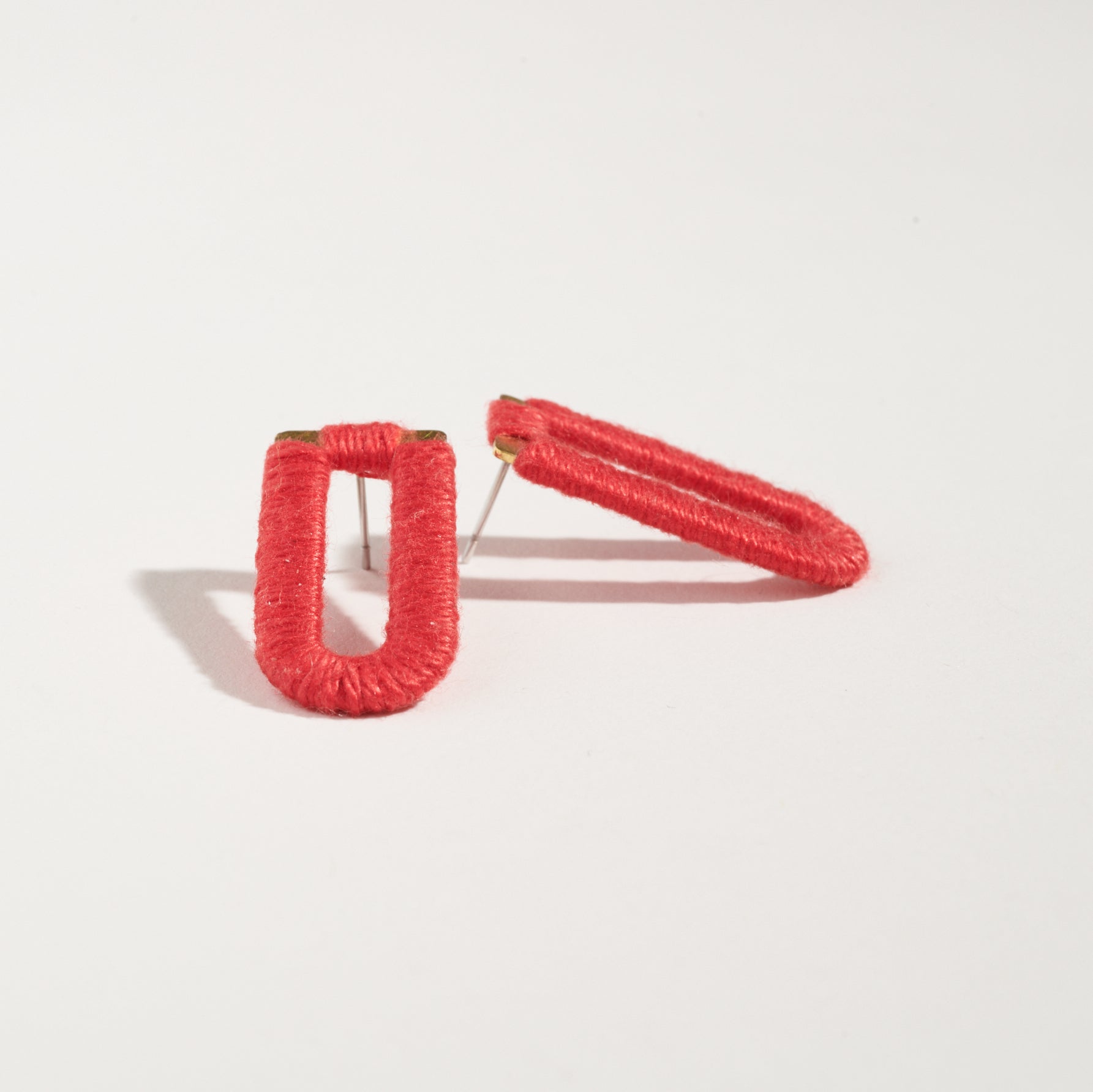 Simple and modern geometric post earrings. Shown and modeled in Scarlet Cotton. (not currently available. Tomato Linen is the closest match.)