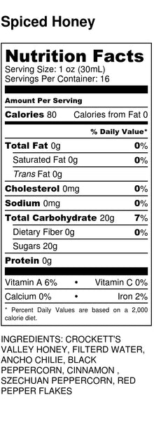 Our spiced honey mixer starts with a base of local Crockett's Valley Honey and is enhanced with our custom blend of five spices. As the black peppercorns, red pepper flakes, ancho chili, cinnamon, and Szechuan pepper hit your taste buds, you're left with a warm, rich, honey experience. This mixer is perfect with bourbon, tequila, rum, coffee, or your favorite hot tea. If you're feeling wild, try it drizzled atop some vanilla bean ice cream!