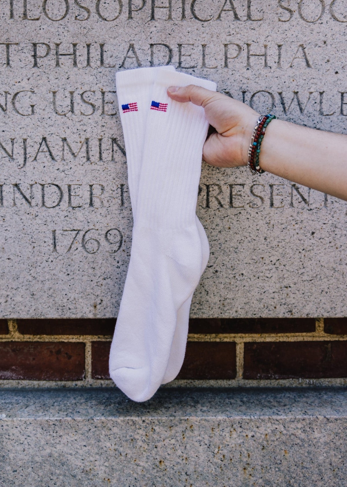 This white crew is a bit longer than our standard Retros with an intarsia-knit flag and full-terry cushioned footbed. As always, our socks are made at a family-owned factory in North Carolina using American cotton with an outstanding construction.