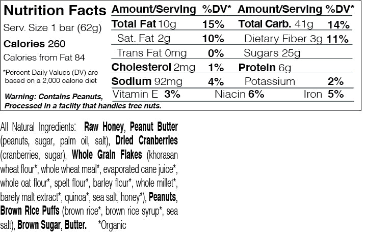 Light and crispy, yet moist and chewy, the combination of raw honey, peanut butter, brown rice crisps, cranberries, and whole peanuts just can't be beat!
