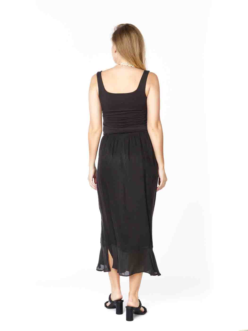 Our signature Tulip Skirt features a "Striaght-line" frame which affords a long flattering drape. This pull-up skirt has a gathered 1/2" elastic waist band. It also features bottom panels made of of shear tissue Crinkle Bemberg.
