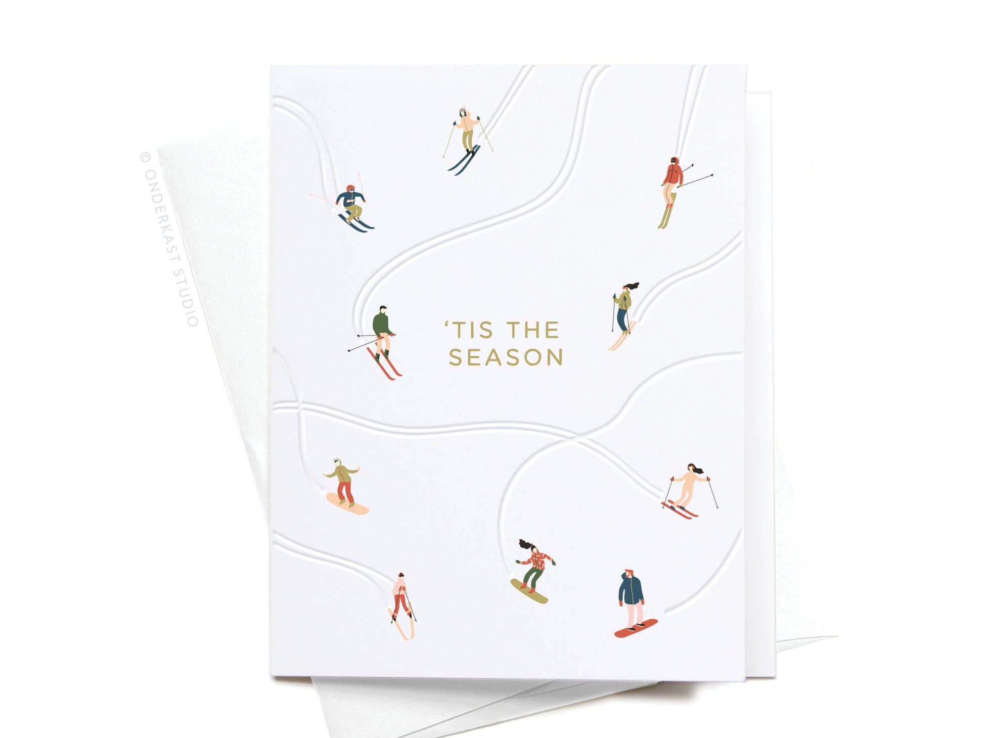 Celebrate the festive season with the 'Tis the Season Skiiers Letterpress Greeting Card. Featuring a charming illustration of skiers enjoying a winter wonderland using unique letterpress details, this card brings the joy and excitement of the holidays to life.
