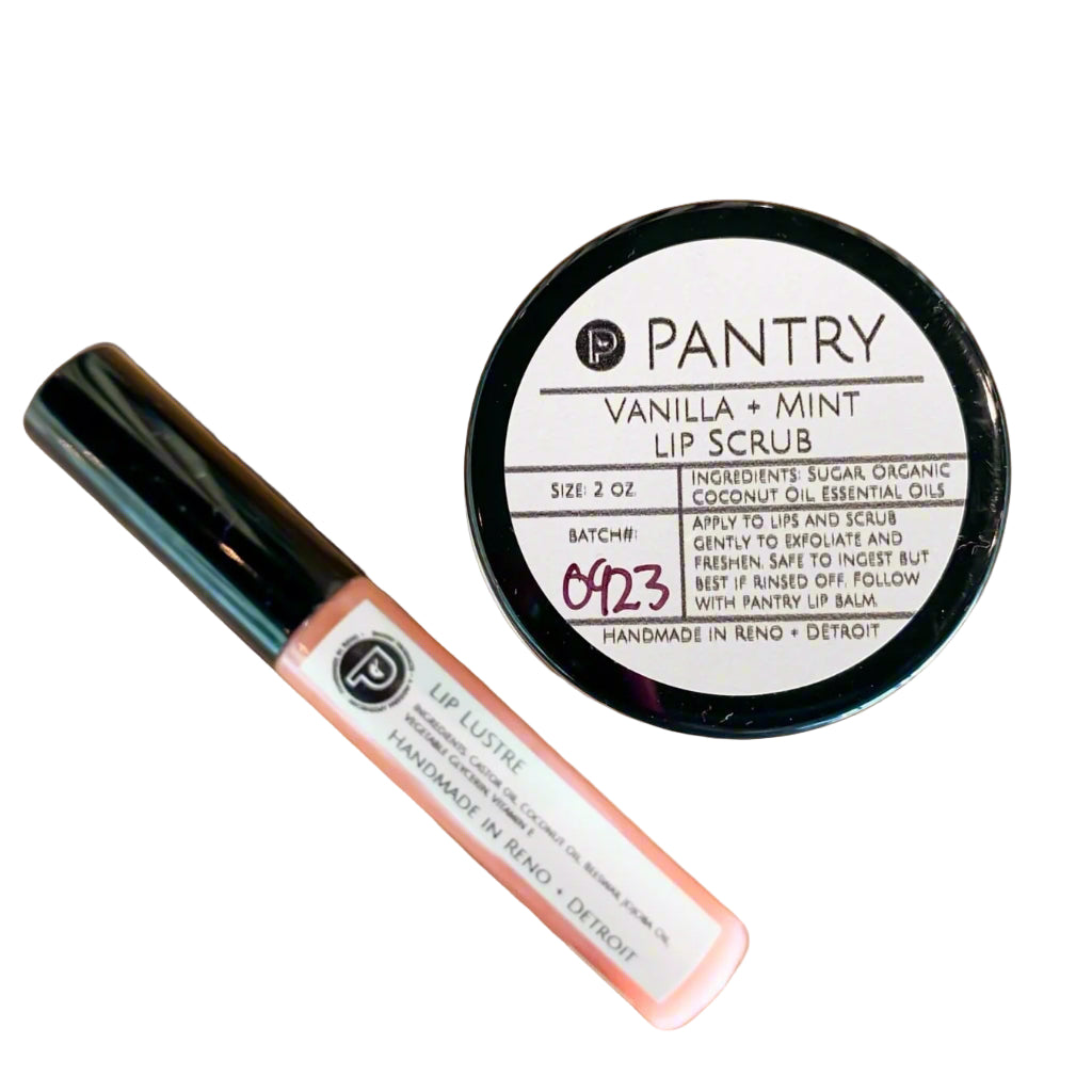 Gently exfoliate + condition your lips with Pantry’s Vanilla + Mint Lip Scrub.To use: Apply a pea-sized amount to lips + gently polish off dry skin. Rinse, wipe or lick off. Since it's 100% all-natural, it is perfectly safe to eat. Mmm!