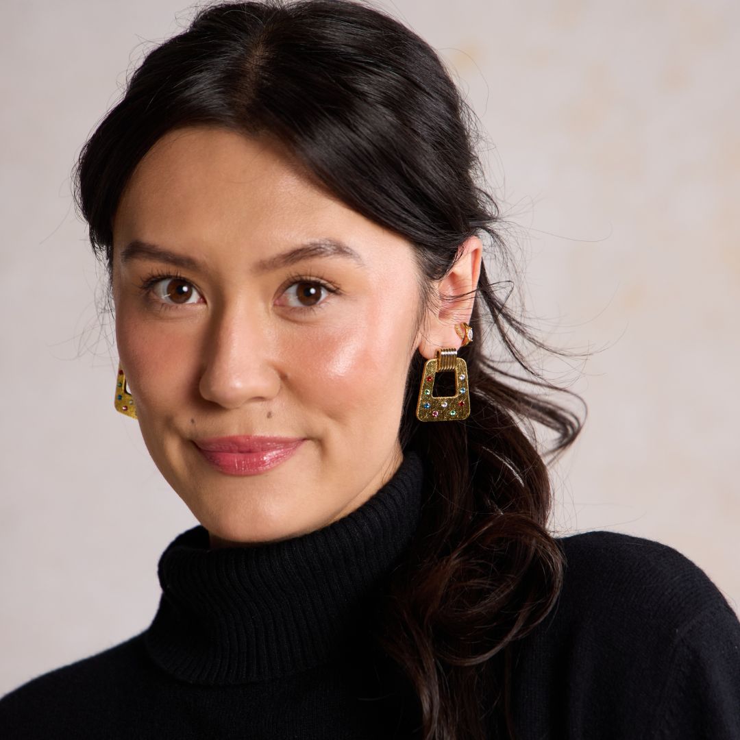 Timeless style meets a modern silhouette with the Avery earrings. This lightweight statement earring is created with our premium firm Vintage Gold leather with jeweled accents and a beveled gold or silver stud component.