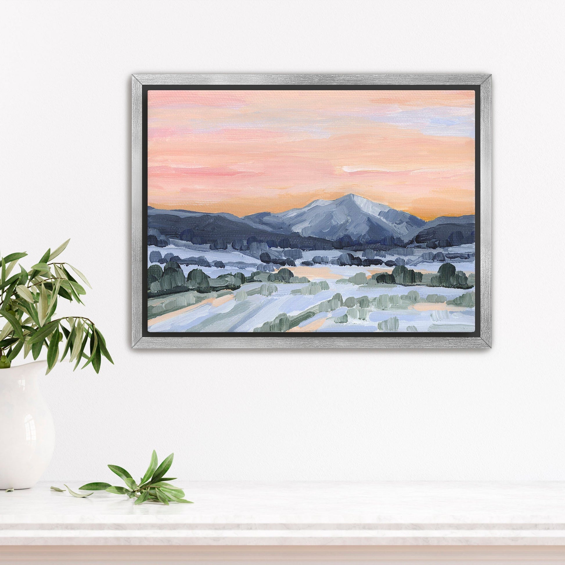 The fine art print of "Watching Sunsets" is a reproduction of an original acrylic landscape painting inspired by the diverse and colorful scenery of Glenwood Springs, Colorado in winter. With playful brushstrokes and vibrant colors, this mountain wall art captures the essence of the iconic Rocky Mountain landscape—with distant blue mountains and a valley covered in snow. Available in a variety of art print sizes, this landscape art print showcases a minimalist, impressionist style and is perfect for bringing the beauty of Colorado into your home.