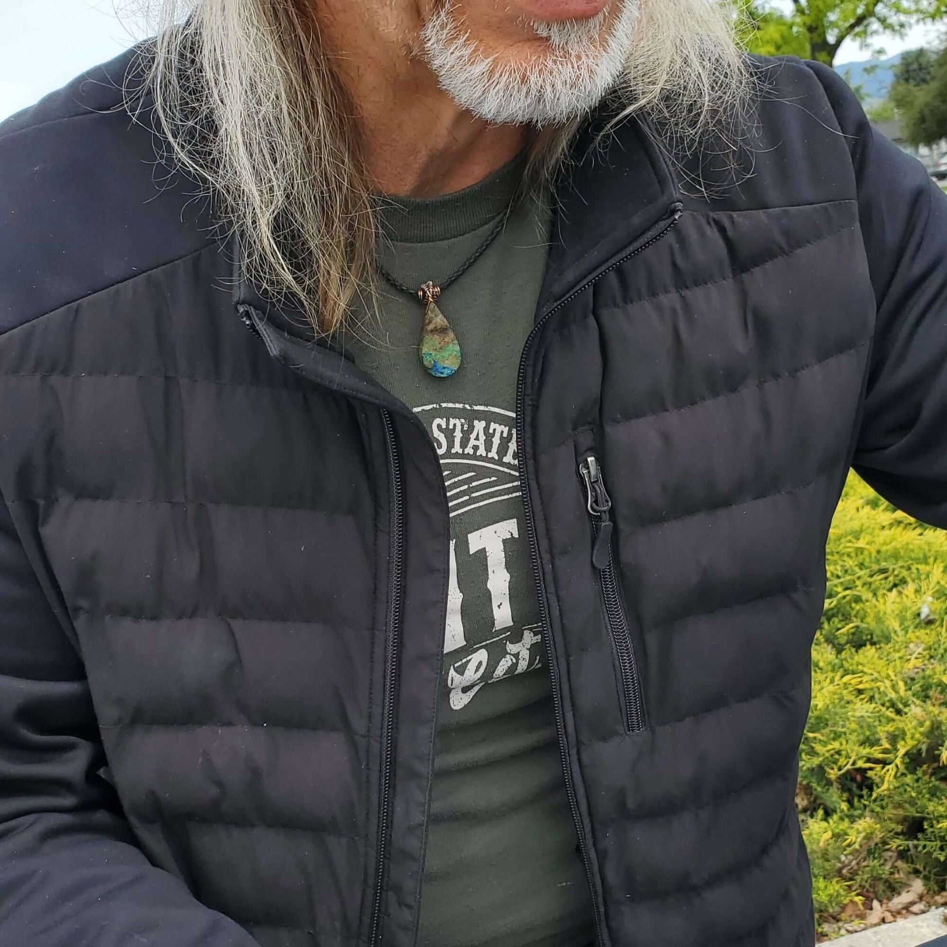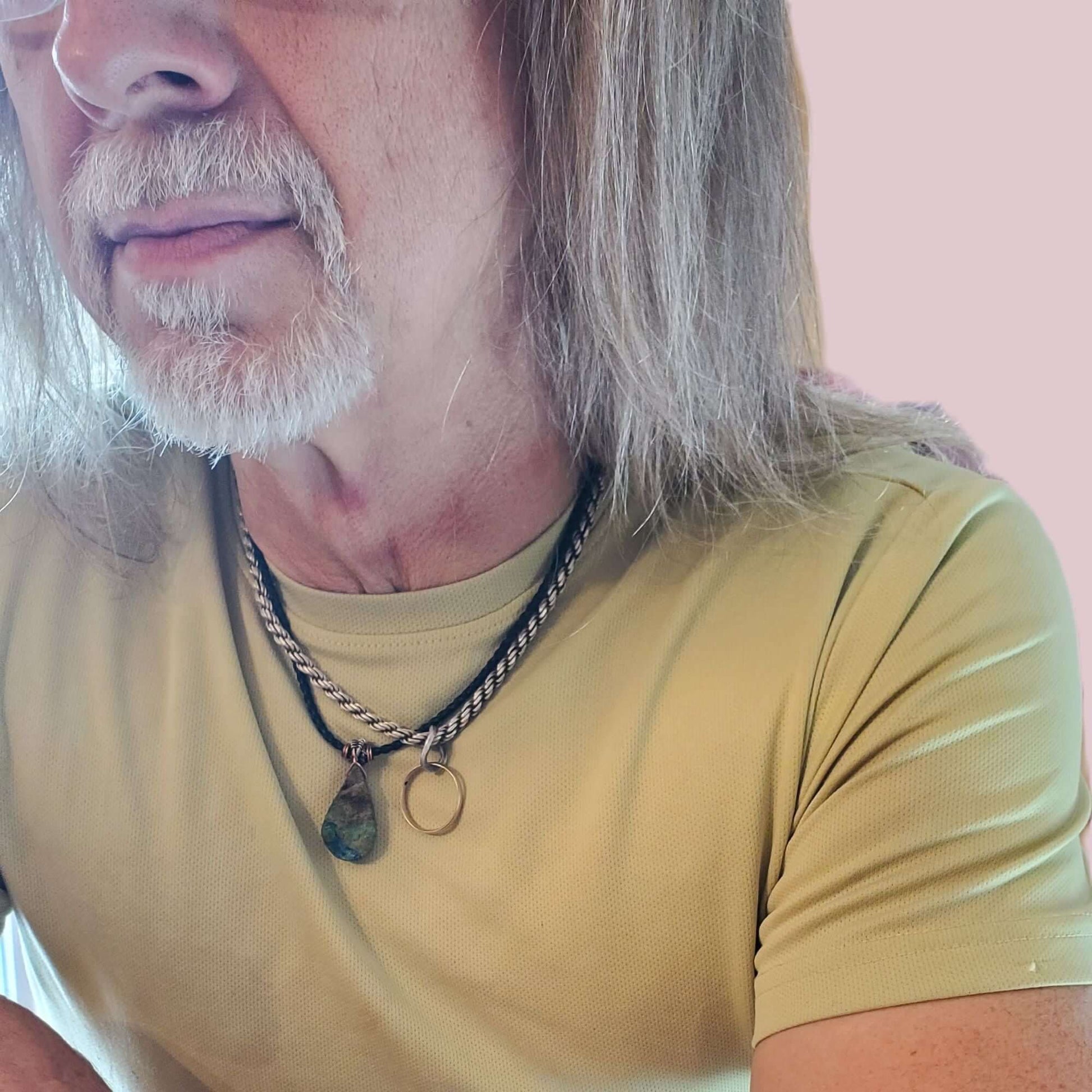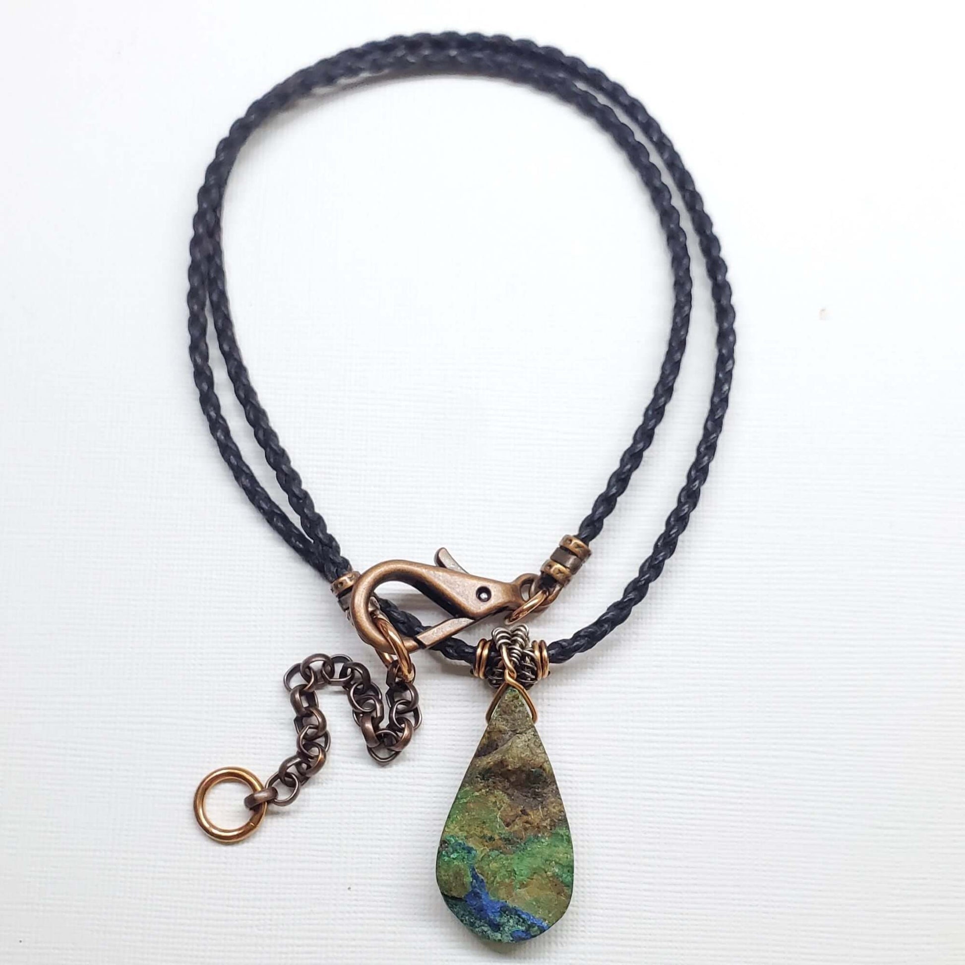 Experience the beauty of nature with this Wire Wrapped Natural Cut Blue-Green Azurite Malachite Drop Vegan Cord Necklace! This unique piece features a handcrafted wire-wrap design showcasing the natural cut of the exquisite azurite malachite stone. The genuine gemstone is NOT color enhanced—you're seeing nature's true colors! The 3mm black vegan braided cord adds sustainability, while the larger copper lobster clasp and endcaps make this necklace suitable for larger masculine hands. Embrace the rugged beauty of earth and elevate your style with this original design. Copper is said to be very health-beneficial as well!