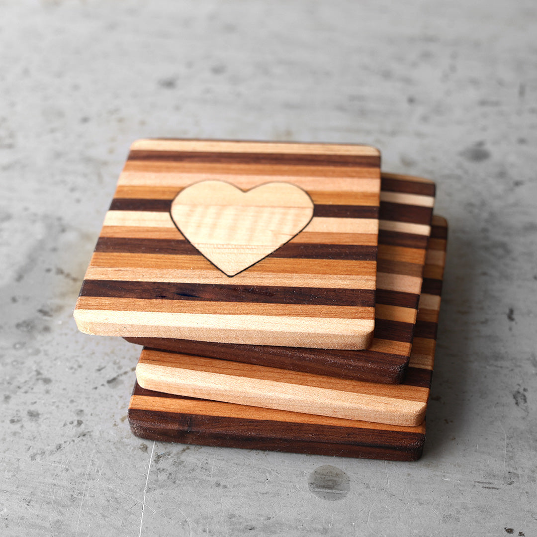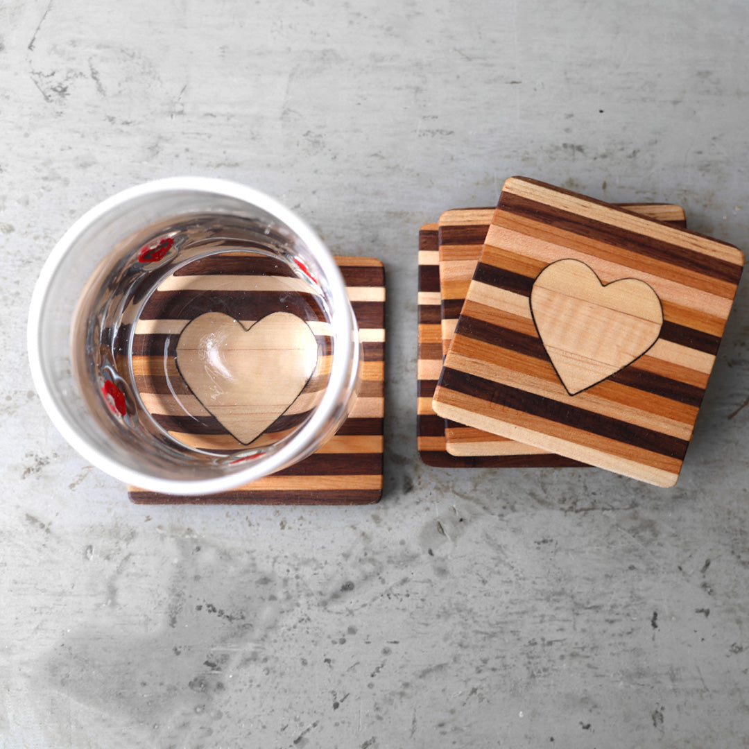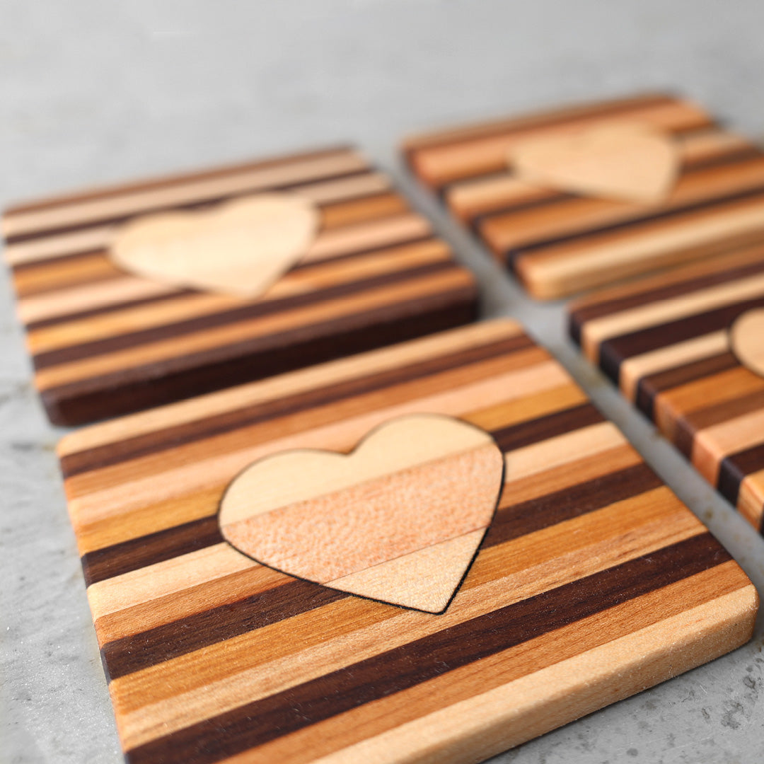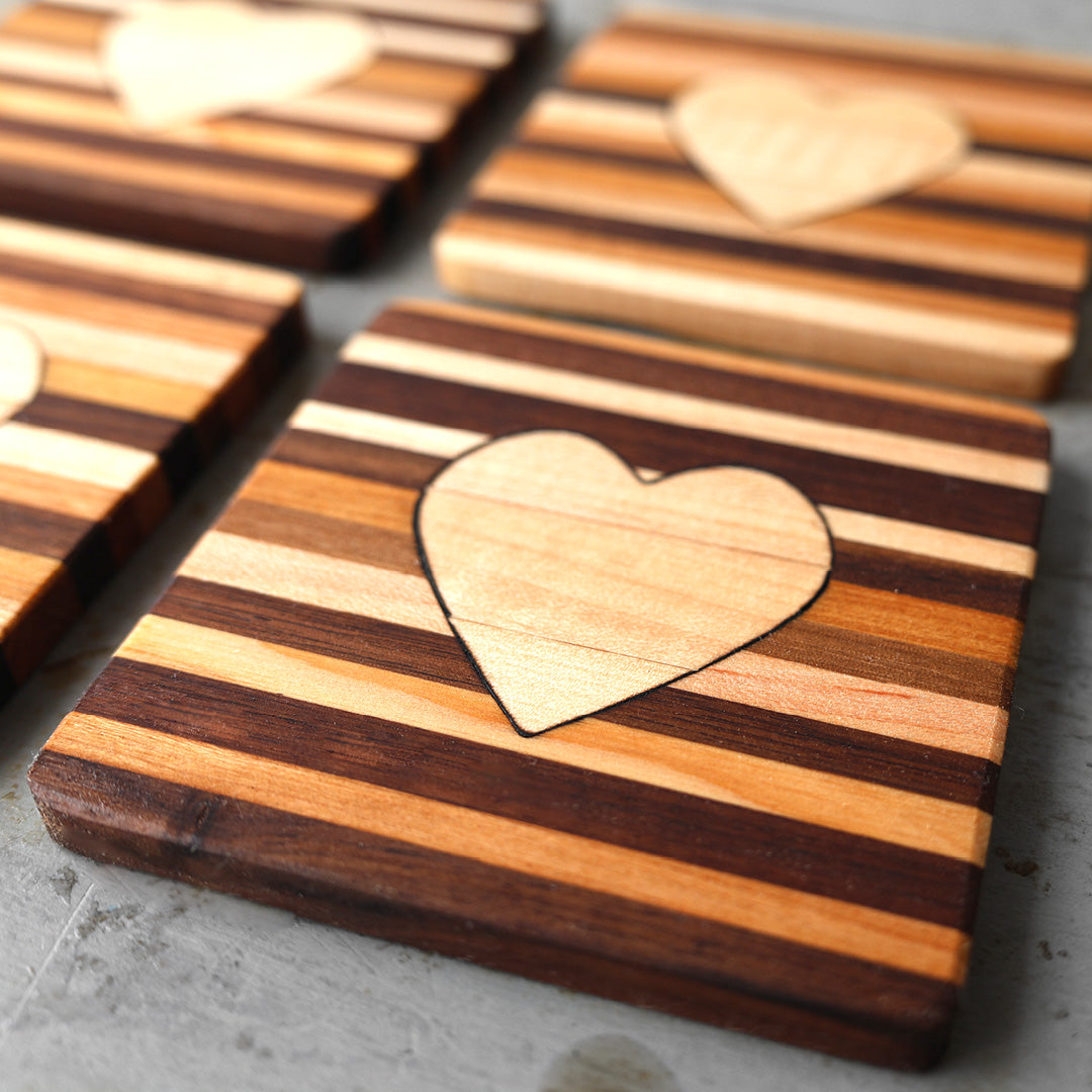 Glued-up remnants collected from our Texas workshop are the main source of wood for these heart embellished coasters—they are beautiful, sustainable, handcrafted gifts!