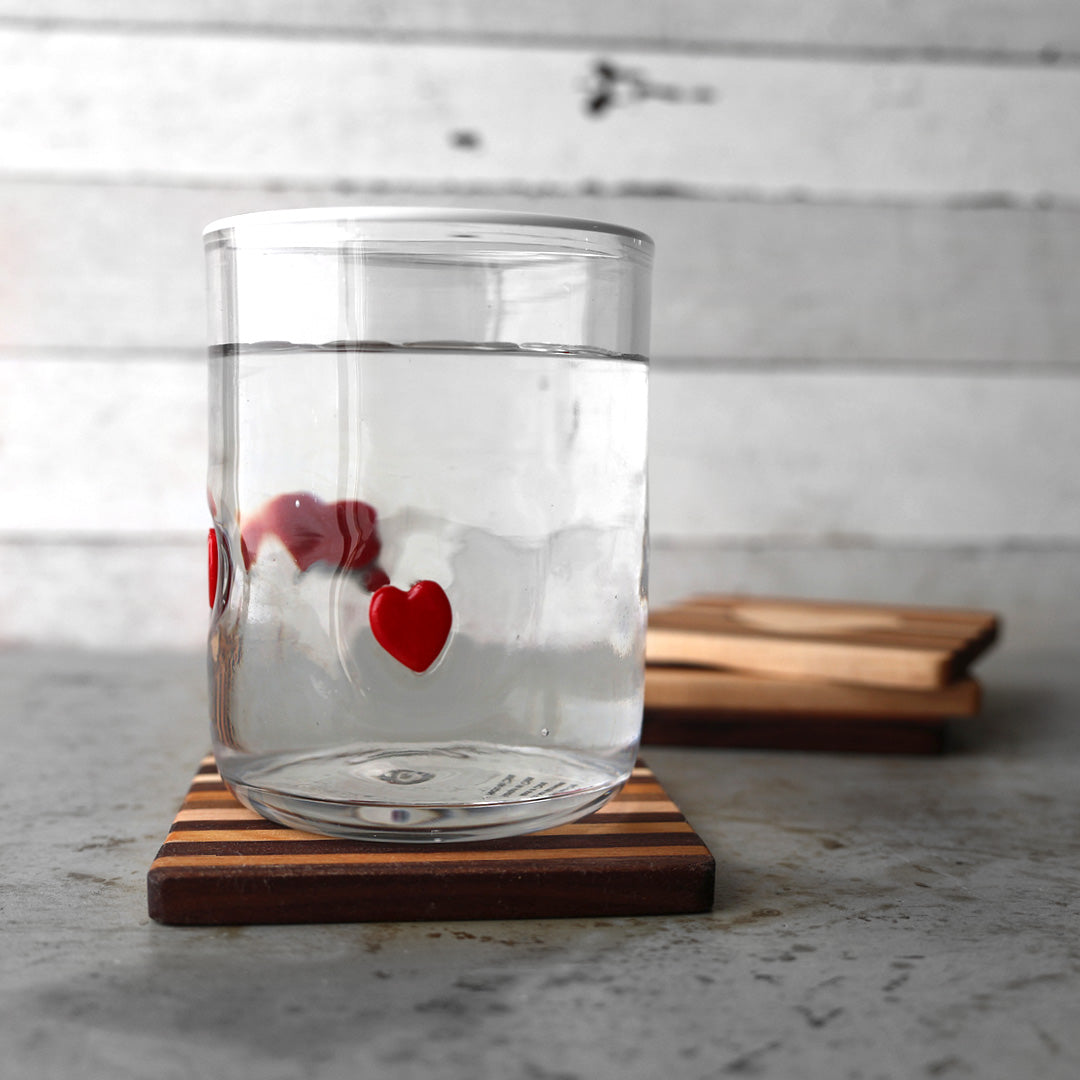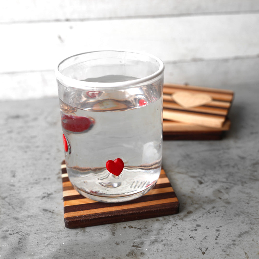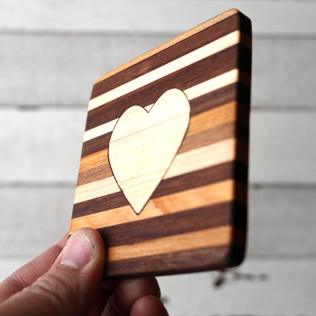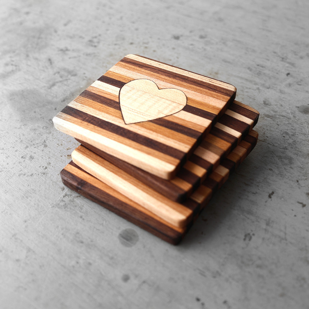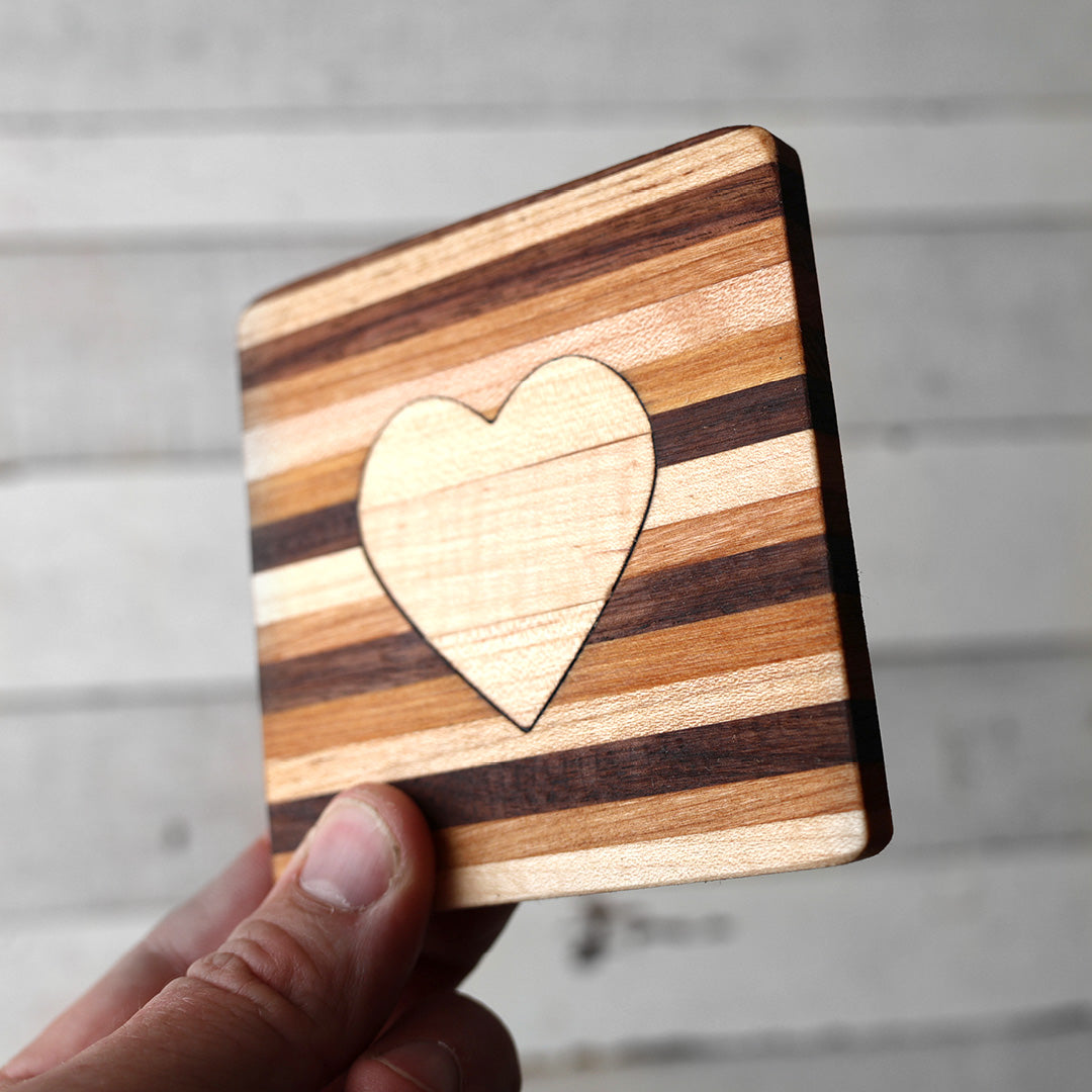 Glued-up remnants collected from our Texas workshop are the main source of wood for these heart embellished coasters—they are beautiful, sustainable, handcrafted gifts!